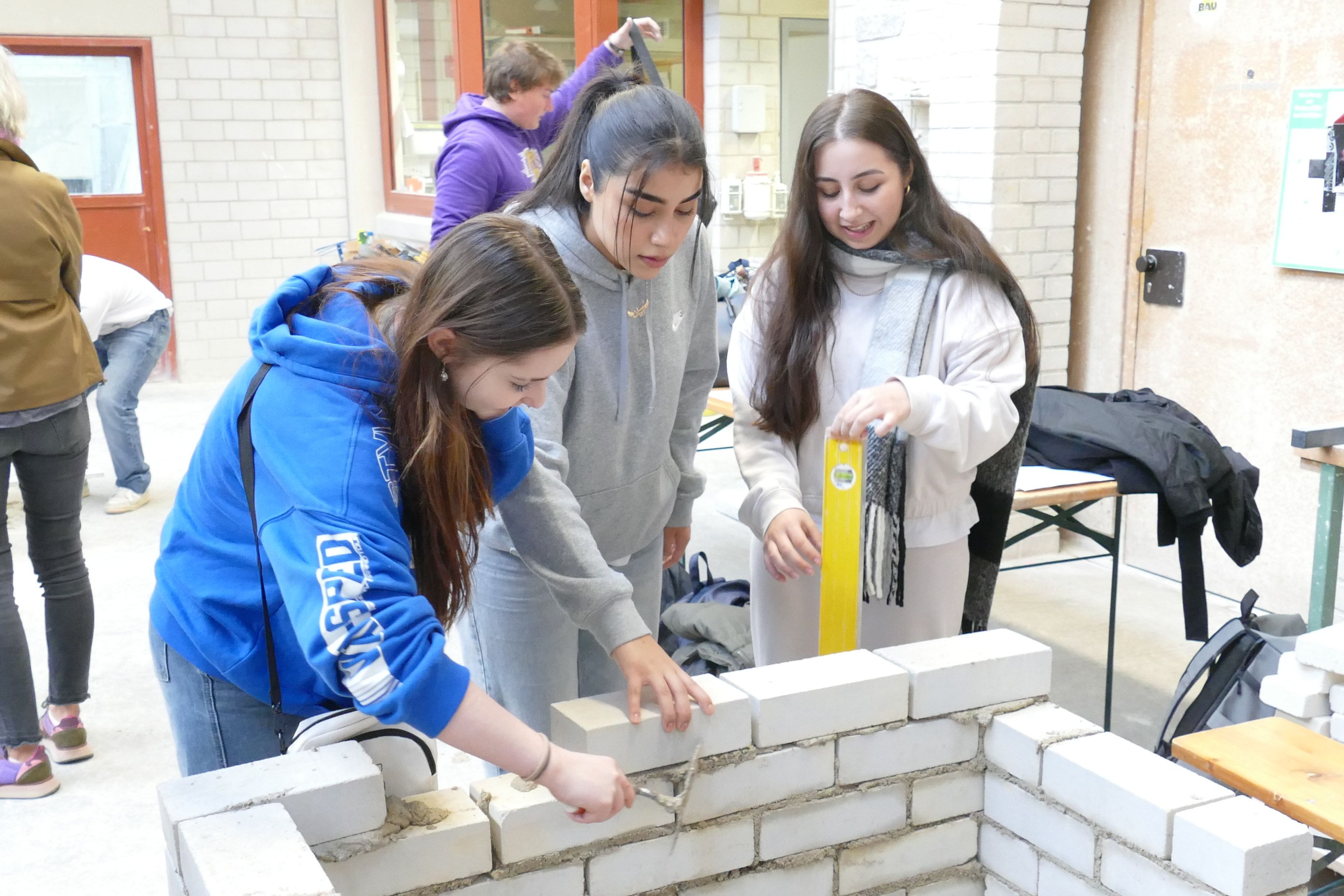 Vor Ort wurde den Jugendlichen ein abwechslungsreiches Programm geboten. Nach einem Einführungsvortrag stand ein Rundgang durch die Ausbildungshallen auf dem Programm. Hier konnten die Teilnehmerinnen und Teilnehmer die Praxis der Bauberufe hautnah erleben und ihr handwerkliches Geschick bei kleinen praktischen Aufgaben erproben - zum Beispiel beim Versetzen von Mauerziegeln, beim Zuschneiden von Fliesen oder beim Führen eines Minibaggers.