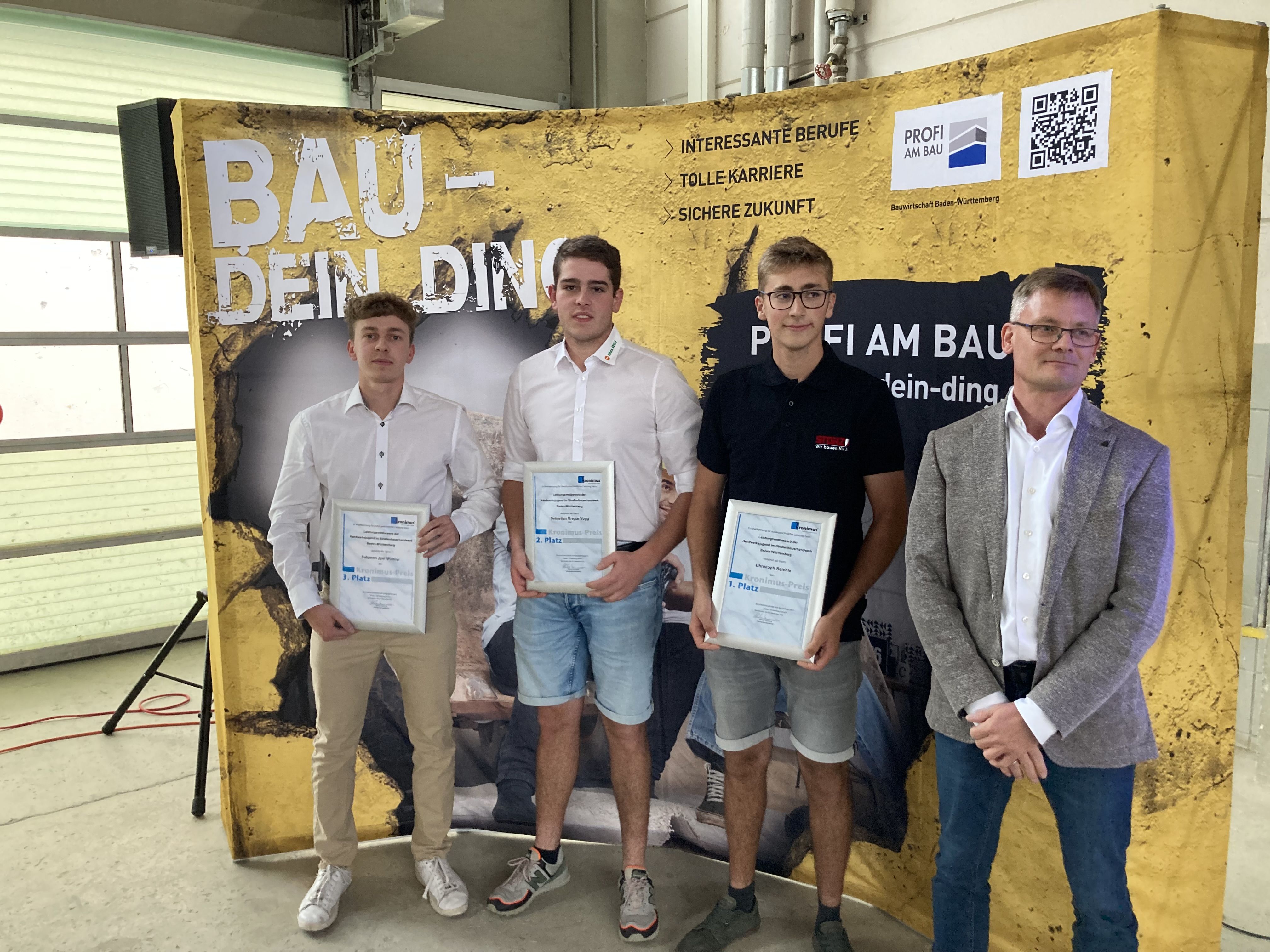 Landessieger der Straßenbauer ist in diesem Jahr Christoph Reichle aus Horgenzell, der seine Ausbildung bei der J. Friedrich Storz Verkehrswegebau GmbH & Co. KG in Tuttlingen absolviert hat. Den zweiten Platz erreichte Sebastian Gregor Vogg aus Boos; sein Ausbildungsbetrieb ist die Max Wild GmbH in Berkheim. Platz 3 belegte Salomon Joel Winkler aus Haiterbach, der bei der Rath GmbH & Co. KG in Haiterbach ausgebildet wurde.