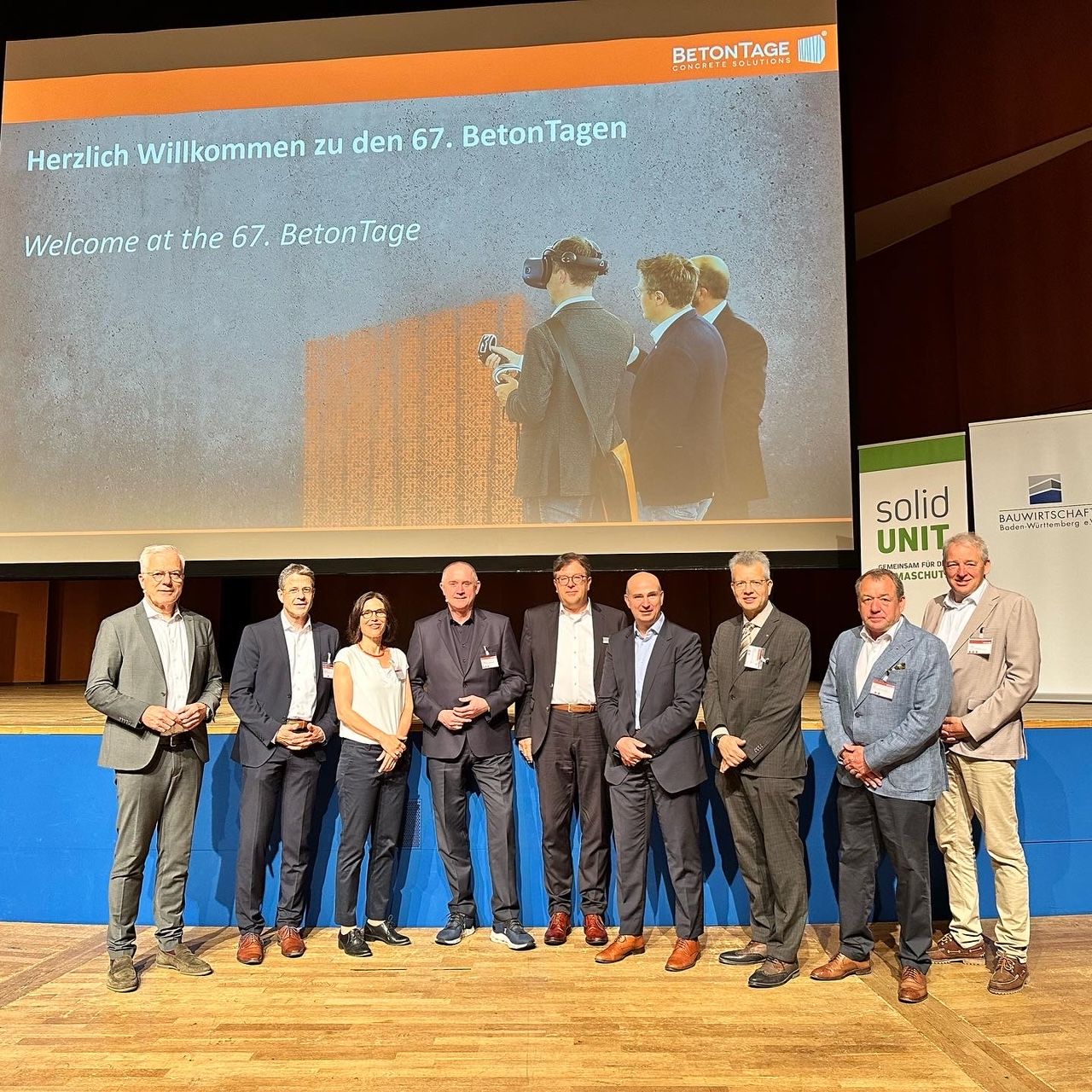 Bildunterschrift: (v.l.n.r.) Thomas Zawalski (Geschäftsführer solid UNIT Deutschland), Steffen Schönfeld (LEONHARD WEISS GmbH & Co. KG), Wiebke Zuschlag (Leitung Presse- und Öffentlichkeitsarbeit), Ulrich Nolting (Geschäftsführer InformationsZentrum Beton GmbH), Dr. Ulrich Lotz (Geschäftsführer FBF), Prof. Dr. Lucio Blandini (Vorstand Werner Sobek AG und ILEK), Thomas Möller (Hauptgeschäftsführer Bauwirtschaft BW und Vorstandsvorsitzender solid UNIT), Markus Böll (Präsident Bauwirtschaft BW), Dirk Siegel (Geschäftsführer Bildungsakademie der Bauwirtschaft BW)