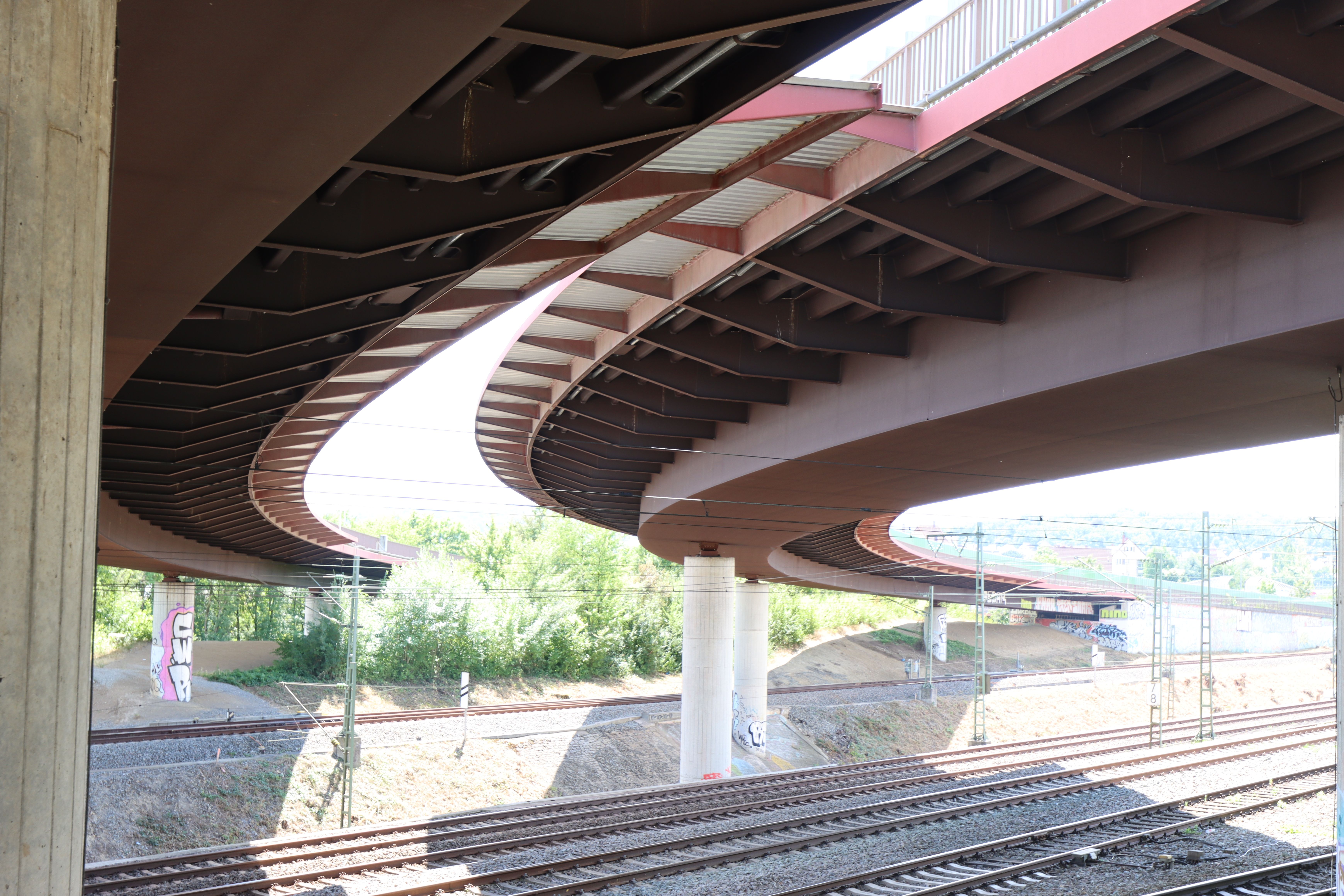 Diese Brücke liegt bei Plochingen, überquert die Fils und verbindet die Stadt Esslingen mit Göppingen. Sie ist ein Negativbeispiel für den fragilen Zustand unserer Infrastruktur: Bereits mit bloßen Auge lassen sich notdürftige Restaurationsarbeiten an den Pfeilern erkennen, sie ähneln einem Flickenteppich. Nicht überraschend ist die Bewertung mit Note 3,5 (Bewertung der BASt). Mittlerweile fahren täglich mehr als 50.000 Fahrzeuge über die 212 Meter lange und 48 Jahre alte Brücke, dennoch ist seitens des Lands Baden-Württemberg noch keine Ertüchtigung geplant!